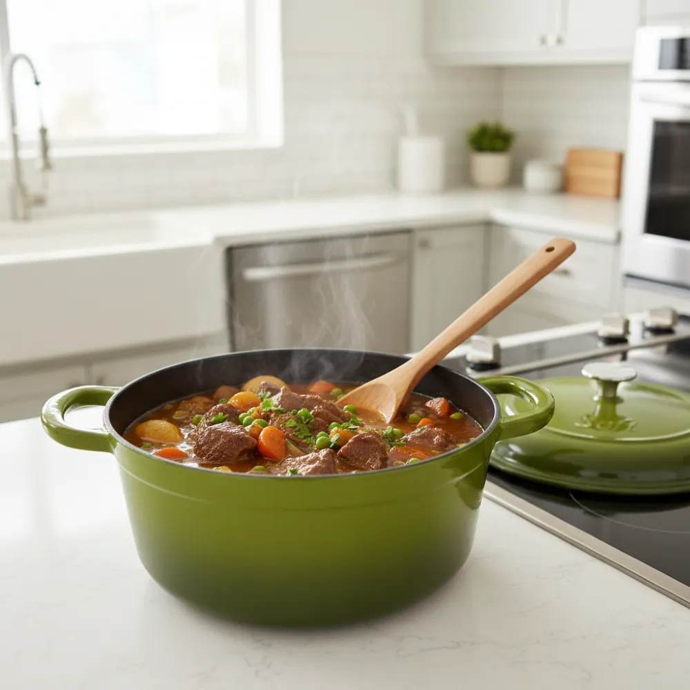 Designul adânc păstrează lichidele și aromele în interior, controlând evaporarea și menținând textura preparatelor. Este alegerea potrivită pentru mâncăruri consistente, porții de familie și rețete care cer răbdare.